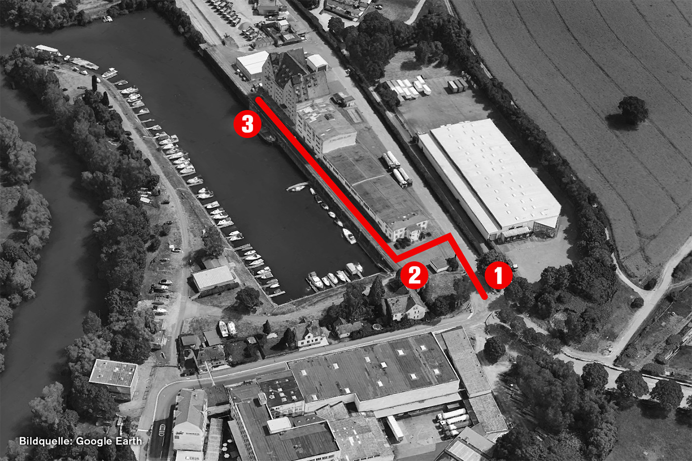 - Seid ihr einmal durch das Rolltor gelangt, dann haltet euch links. Dort befinden sich die Verwaltung von Transkal sowie die Wasserschutzpolizei. Geht daran vorbei in Richtung Hafenbecken. Dort ist ein weiteres großes Tor, das jedoch immer geöffnet sein sollte. Der Weg ist befahrbar. Ihr könnt nun den Schildern zum Fuldaschifffahrtsmuseum folgen, denn das befindet sich im selben Gebäude wie wir.